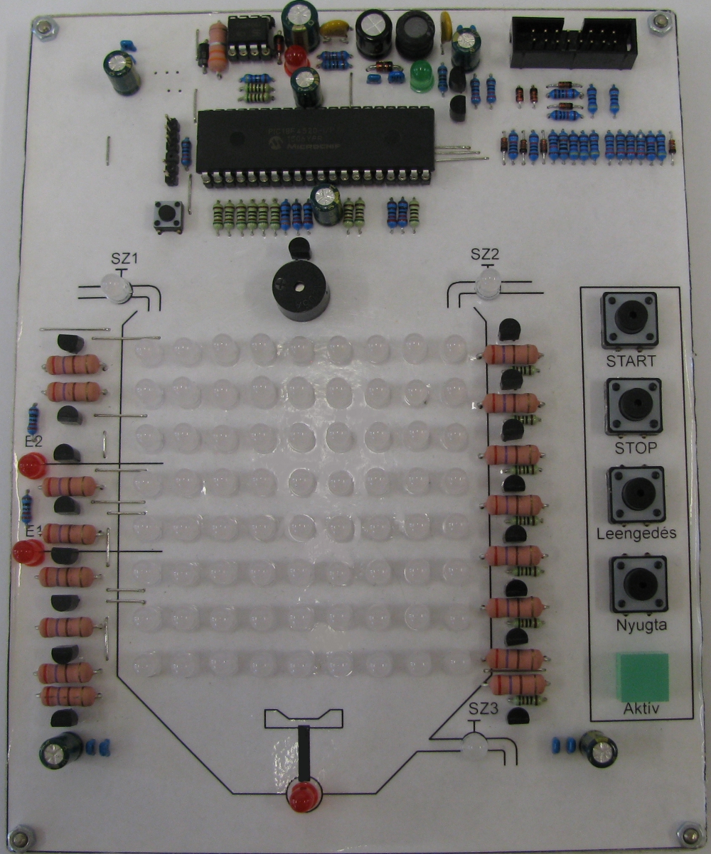 Az emulációs panelünk egy festékkeverő berendezést hivatott modellezni. Ebben a feladatban két különbözö folyadékot kell eljuttetni egy tarátlyba, maj azokat összekeverni. A tartályba a folyadék két szelepen (SZ1 és SZ2) kersztül jut el, amelyet a PLC kimenetéről vezérelhetünk. A szelepek nyitott, illetve zárt állapotát egy-egy piros-zöld kétszínű LED jelzi. A tartályba bejutó két különböző színű festéket egy LED mátrix jelzi soronkét piros és zöld színnel. A folyadékok összekeverését a keverőmotor (M) lapátjai végzik, amit szintén a PLC kimenetéről vezérelhetünk. A keverdés nagyon látványosan jelenik meg a LED mátrixon, ugyanis egy folyamatos színátmnetet láthatunk, ahogy a zöld és a piros szín átmegy sárgába! A tartályt leereszteni a PLC-ről vezérelt SZ3 szelep segítségével lehet, állapotát ennek is egy kétszínű LED jelzi. A tartály kiürülését az emulációs panel az E2 alsó szintérzékelő segítségével továbbítja a PLC felé. Amennyiben a keverő berendezés aktív, akkor azt a panelon lévő zöld LED blokkal kell jelezni a PLC programból. A berendezés működtetéshez 4 nyomógomb csatlakozik a PLC bemenetéhez: START, STOP, Leengedés és Nyugta. A START-STOP párossal elindítani illetve leállítani lehet a folyamatot. Bizonyos ciklusszám után a készüléket ki kell tisztítani. Addig nem indul el újra a folyamat, amíg le nem engedtük az összes folydékot és a tartályt ki nem tisztítottuk. Erre szolgál a Leengedés és a Nyugta nyomógomb.