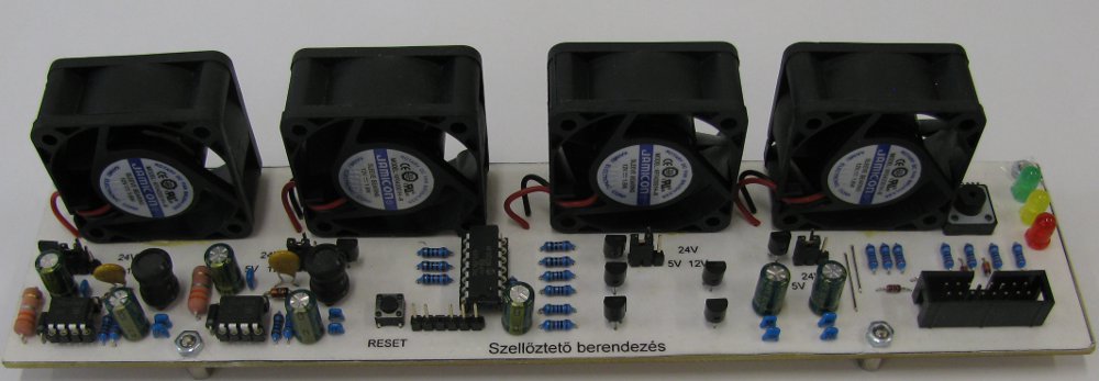 Az emulációs panelünk egy szellőztető rendszert hivatott modellezni. A szellőztető rendszer egy mélygarázs szellőztetőrendszerének felügyeletét végzi el. A mélygarázsban 4 db ventillátort helyeztek el, amelyek működéséről ad tájékoztatást a berendezés. A piros arról tájékoztat, hogy már kettőnél kevesebb ventillátor működik, a garázsba tilos behajtani, illetve el kell hagyni azt. A sárga jelzés esetén két ventillátor működik, a szellőztetés még megfelelő, de nem ajánlatos a garázsban tartózkodni. Zöld lámpa esetén 3 vagy 4 ventillátor működik, a szellőztetés megfelelő. Ez tulajdonképpen egy egyszerű 4 változós kombinációs hálózatot takar, amit akár szimulátorban is is teszteltelhetünk kapcsolók és lámpák berakásával. Az emulációs panel használatával azonban sokkal szemléletesebbé tehető a feladat, és a megírt program tesztelése is sokkal könnyebb. Ez annak köszönhető, hogy a panelon lévő nyomogomb segítségével a 4 ventillátor működésének 16 lehetséges kombinációját sorban végig léptethetjü, miközben fizikailag is látjuk a ventillátorok működését, a 3 jelzőlámpa működését. A panelon használhatunk 5, 12, illetve 24 V-os ventillátort is.