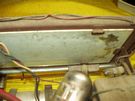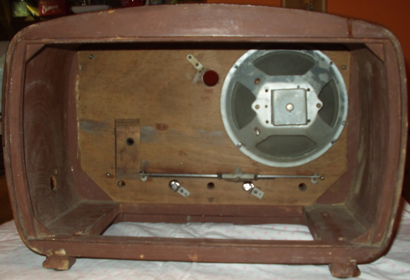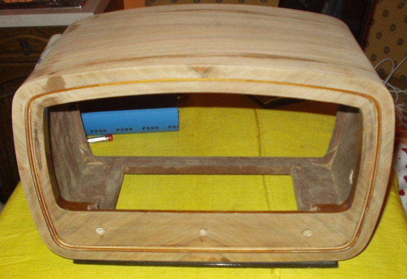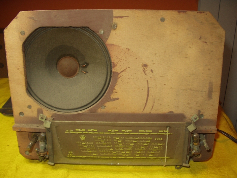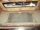 Nagyon poros volt a belseje. A politúr is lepattogott néhány helyen, de a tulajdonos nem kérte a javítását. A skála mögötti üvegről lepattogott a festék, újrafestettem. A fája szétrepedt, mert valaki beletekert vastag pozdorjacsavart (a törött részt kivágtam és pótoltam)! A hullámváltó katasztrofális állapotban volt, kijavítottam. Nagyon szépen szól! |